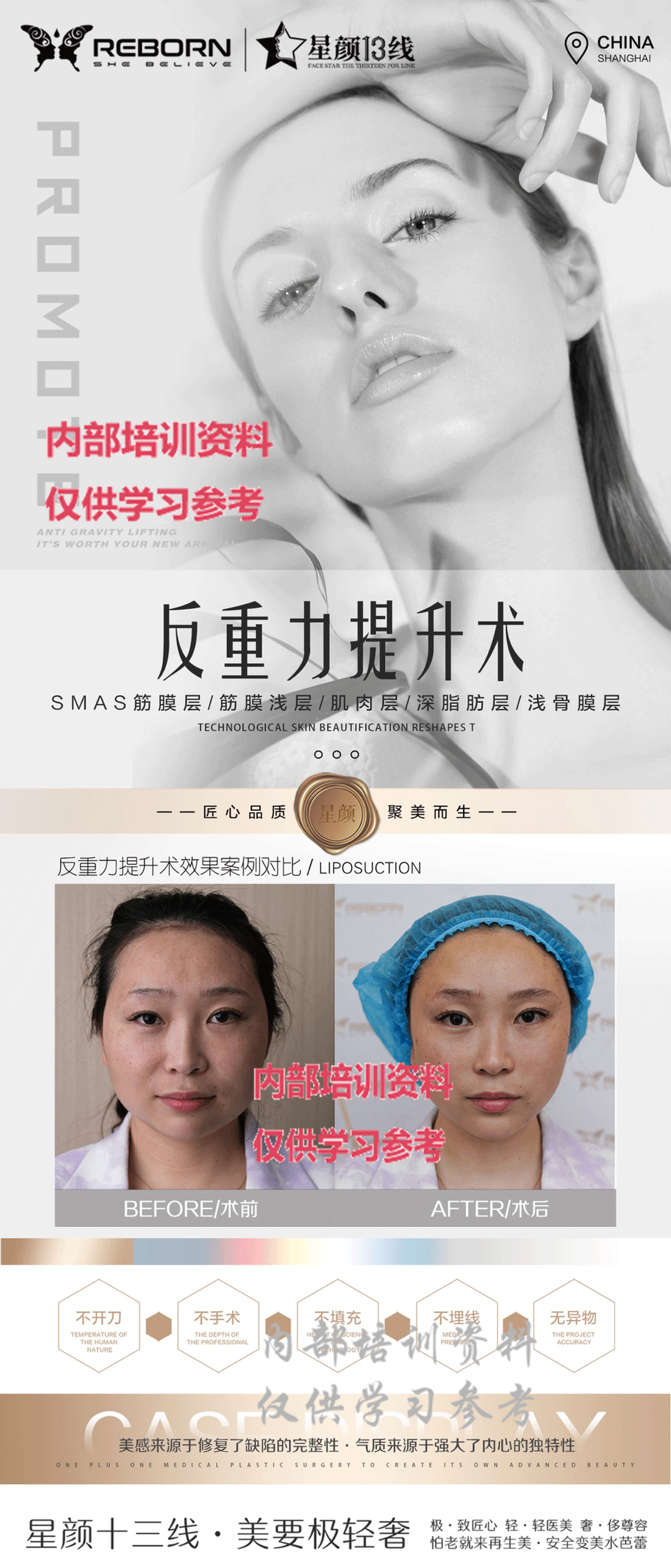 反重力人工韧带(反重力提升技术)就是将提升材料植入到肌肤皮下深层(包括浅脂肪层,SMAS筋膜层,肌肉层,深脂肪层)按照美学、点、线、面的全案设计理念及个人面部特征等综合因素进行面部综合提拉祛皱的一种技术;