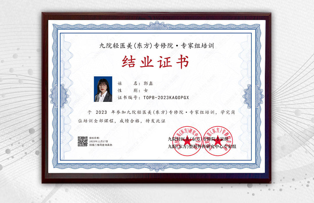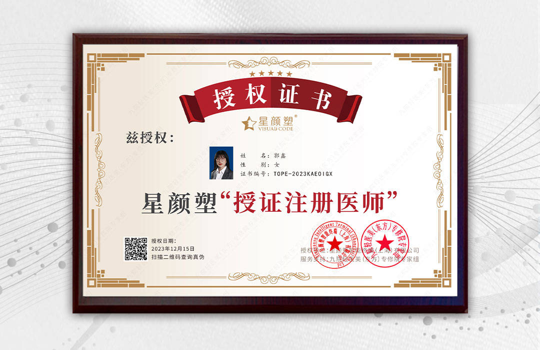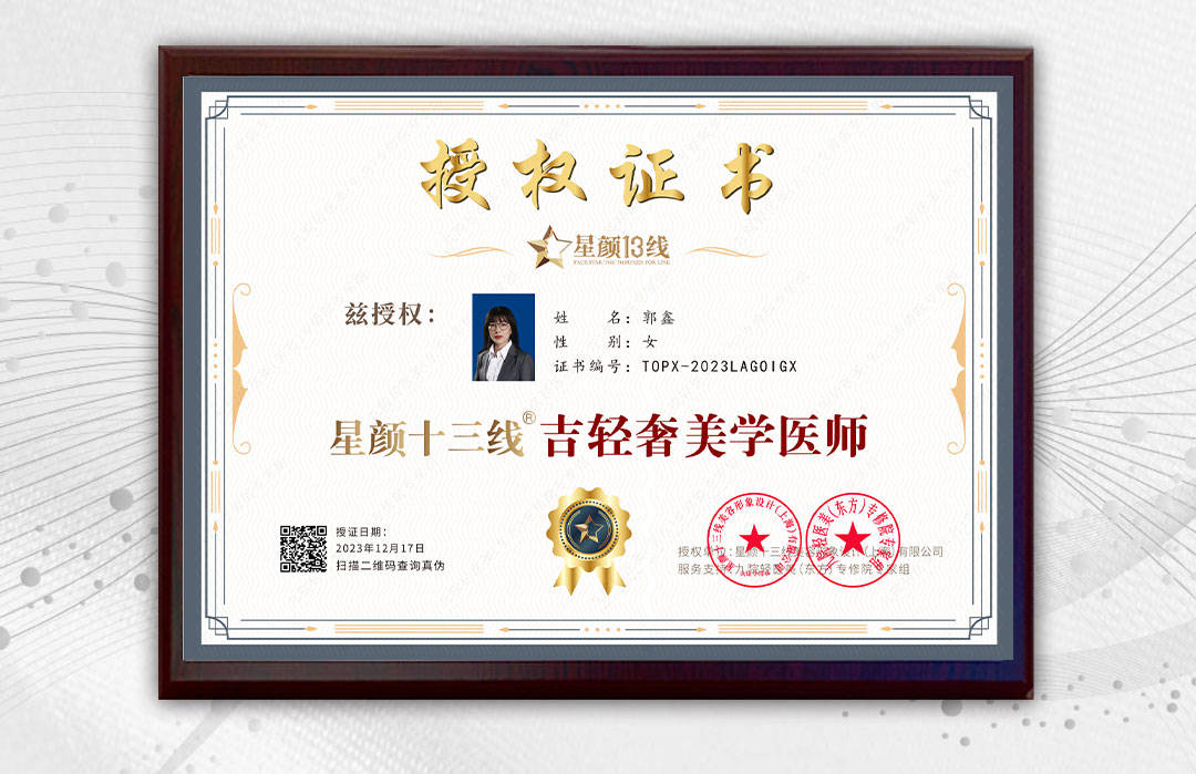 郭鑫医师是一位优秀的执业医师,获得了九院轻医美专修院认证医师证书以及再生美授证注册医师证书和星颜塑授证注册医师证书,星颜十三线®吉轻奢美学医师证书,美学疗愈医师证书,这表明他无论在美容领域还是在心灵疗愈成长领域,有着深厚的功底和造诣。