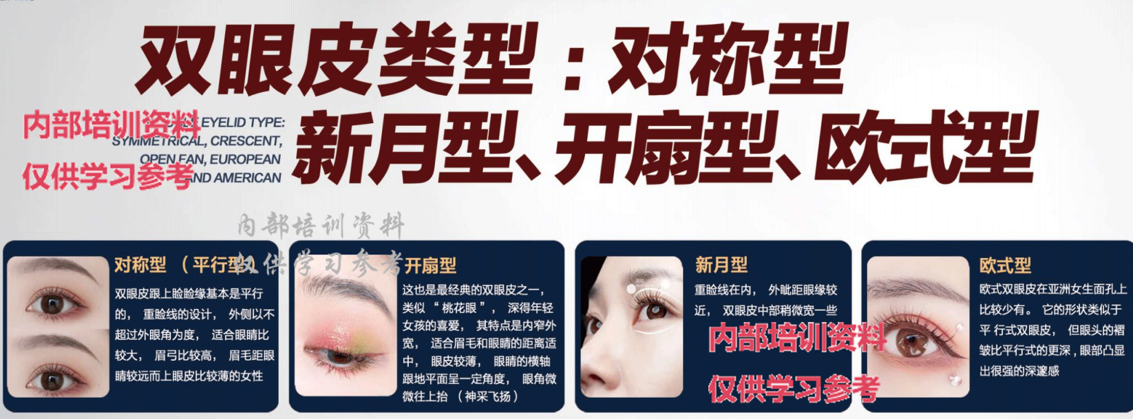 在星颜美眼提升术(再生之美)中,双眼皮类型分为:对称型、新月型、开扇型、欧式型,四大类型(如下图):