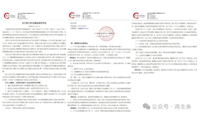 上海英科律师事务所受再生美品牌管理(上海)有限公司(以下简称“委托人”)委托,就其与基茵美药业(山东)有限公司、再生美医疗科技投资控股集团有限公司联合推出的【再生美®】三类医疗器械耗材及品牌授权技术服务品项,针对近期存在部分商家涉嫌通过仿冒再生美®品牌混淆、误导代理商及消费者,特指派沃增明律师发布律师声明如下: