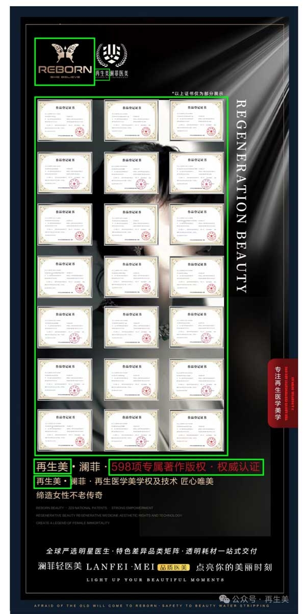 委托人及本律师郑重声明,再生美澜菲医疗科技(杭州)有限公司、浙江再生美澜菲医疗咨询有限公司、再生美瀾菲醫療服務有限公司与委托人及【再生美®】品牌无任何关系。请广大消费者及产品代理商擦亮眼睛,上述再生美澜菲医疗科技(杭州)有限公司、浙江再生美澜菲医疗咨询有限公司、再生美瀾菲醫療服務有限公司均注册于2024年3月,截至本声明发出之日,经国家商标总局网站查询无【再生美·澜菲】商标,市场上宣传的【再生美·澜菲】拥有1833项商标&马德里国际认证纯属虚构,作为新成立的公司拥有318项国家认证专利更是无稽之谈,请广大消费者及代理商不要被不法商家蒙骗。