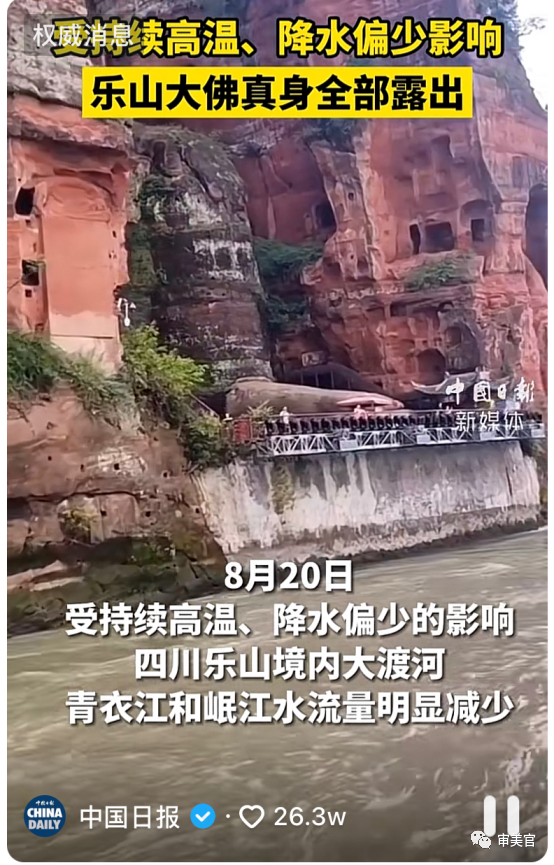 还有四川乐山大佛“显真身”也是同样的原因,大佛脚下的水位因干旱而持续降低,和重庆长江一样汛期反枯,这才连原本在水中的底座,也显露了出来。